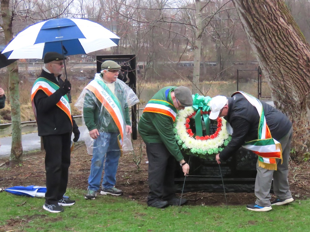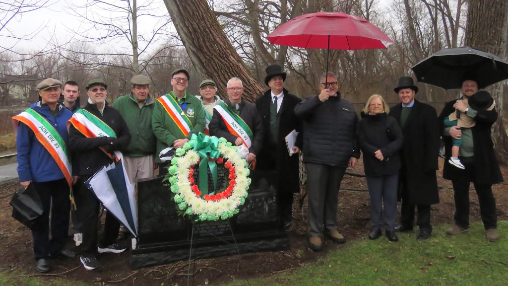 Hartford AOH held its annual wreath laying ceremony on Sunday at the Irish Canal Workers Memorial in Windsor Locks, Conn. Hartford AOH conducted the fund raising for the memorial, which was dedicated in 2022. The memorial honors 400 immigrant laborers who left their homeland in Ireland and came to the area between May 1827 and November 1829 to build the canal bypassing the Enfield Rapids. In particular, it honors those canal workers and family members that are buried in an unmarked cemetery that is located about 100 yards and across the canal from where the memorial is placed.