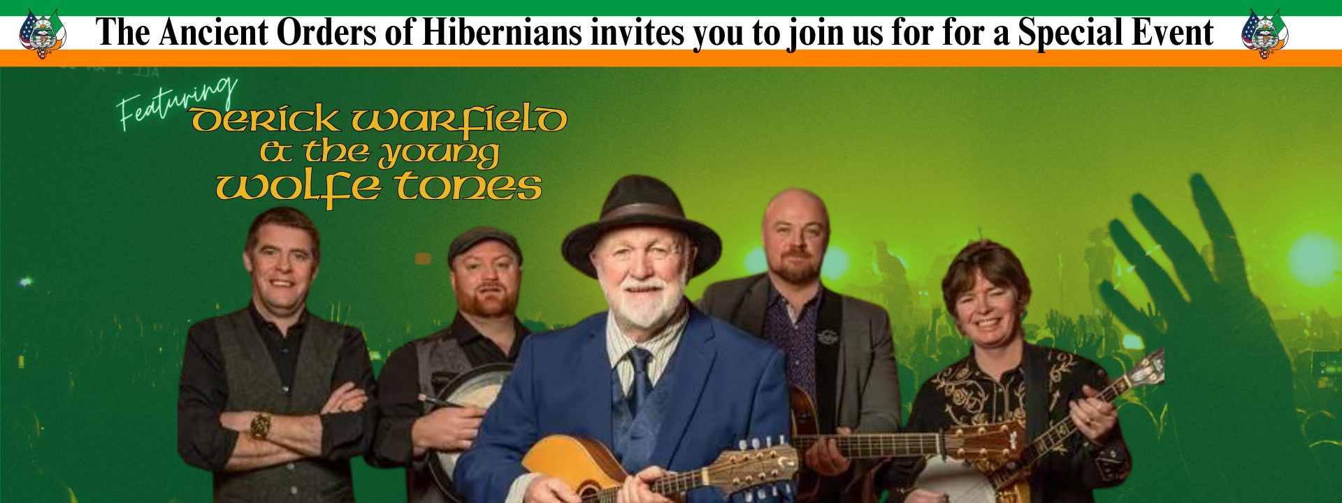The Ancient Order of Hibernians is proud to present an exclusive concert featuring Derek Warfield and The Young Wolfe Tones. Experience the rich tradition of Irish music and song as these legendary performers take the stage.